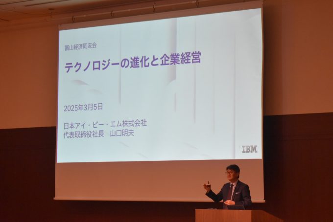 山口氏は、世界経済は成長基調にある一方で、地政学リスクなどにより不確実性が増している現状に言及。日本では、物価・賃金は上昇傾向にあるが、生産性の低さが依然として課題であり、その克服にはイノベーションと生産性の向上が不可欠であると述べた。続いて、AIの進化と今後可能性についてわかりやすく解説し、実際の企業での活用事例を紹介した上で、テクノロジーの進化を見極めた経営判断をするべきであるとした。さらに、IBMでの取り組みとして、従業員一人ひとりに合わせた学習コンテンツの提供や「IBM Skills Build」、IBM地域DXセンターの設置などによる人材育成と地域共創の推進を紹介した。最後に、量子コンピューターやニューロコンピューターといった次世代コンピューティングの開発も進む中、ラピダスと連携し2ナノ半導体の国産化への挑戦を紹介し、より良い社会と地域社会の共生を目指していると述べ講演を締めくくった。